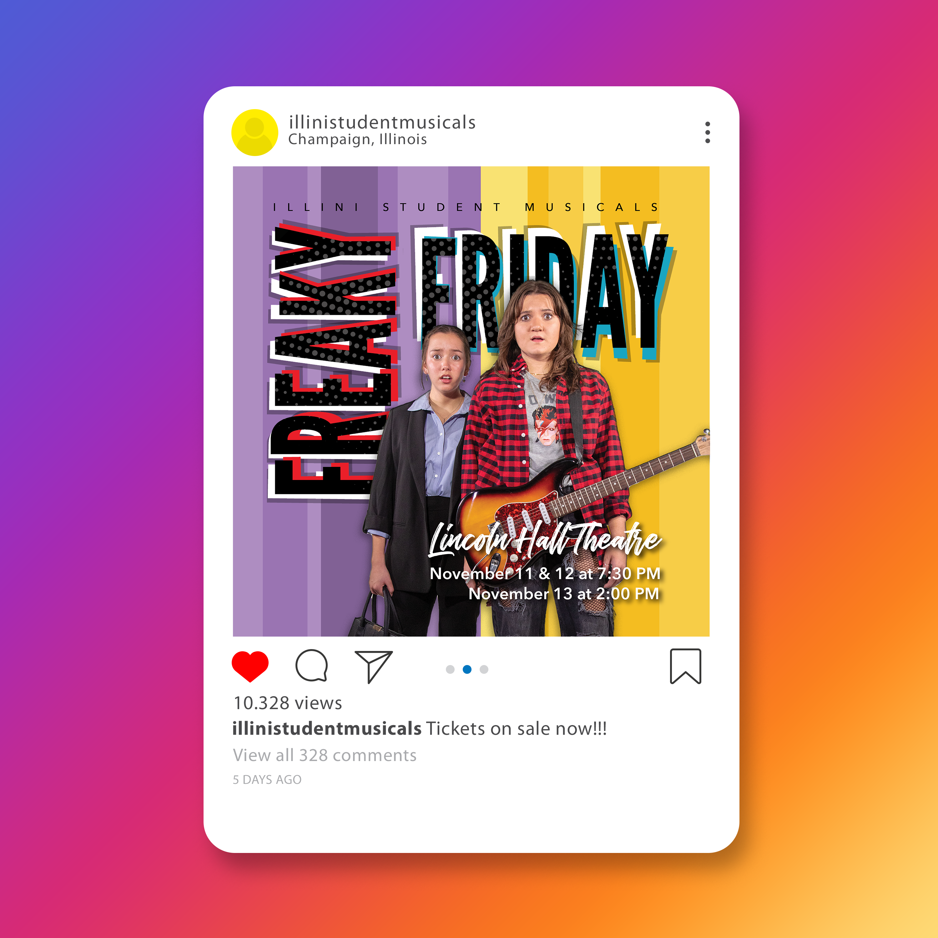 This is a series of advertisements and merchandise designs I created for my university’s student-led theatre, Illini Student Musicals. I served as the group’s Lead Graphic Designer for the Fall 2022 production of Freaky Friday.